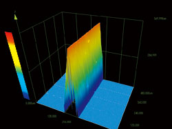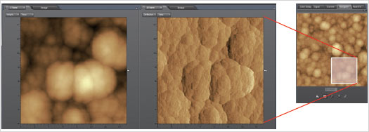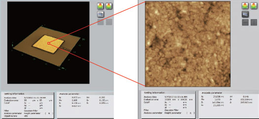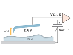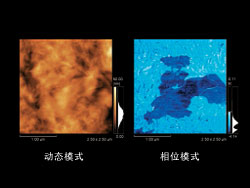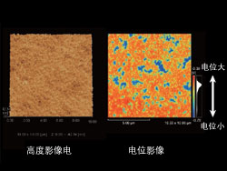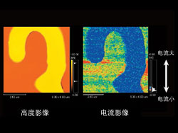 | ![]() Si電路板上的SiO2圖案樣品。高度影像(左)中 顯示為黃色的部分是SiO2。在電流影像(右)中 顯示為藍色(電流不經(jīng)過的部分)。通過上圖, 可以明確電路板中也存在電流不經(jīng)過的部分。 |