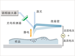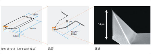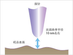 探針顯微鏡的原理 | 探針顯微鏡(SPM)是通過機械式地用探針在樣品表面移動,檢測出探針與樣品之間產(chǎn)生的力、電的相互作用,同時進行掃描,從而得到樣品影像。探針尖端曲率半徑為10 nm左右。典型的探針顯微鏡是原子力顯微鏡(AFM),它通過檢測探針和樣品表面之間作用的引力和張力進行掃描并獲得影像。探針顯微鏡能夠觀察納米級微觀形貌,可以捕捉到樣品最精細(xì)的一面。 |