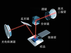 SPM傳感器光路圖 | OLS4500上采用了光杠桿法——通過高靈敏度檢測出最前端裝有探針的微懸臂的微小彎曲量(位移)來進行觀測的方法。在懸臂的背面反射激光,并用壓電元件驅(qū)動Z軸,使激光照射到光電檢測器的指定位置,從而正確讀取Z方向的微小位移。 |
