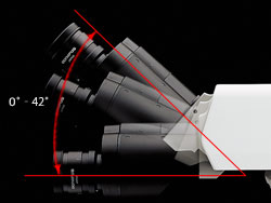 為了適應視點而調整座椅的高度,或是以不合理的姿勢進行檢查的話會浪費時間,降低工作速度。但是,配備傾斜角度為0°~42°(可變高度為150 mm,SEMI S8對應)的傾斜鏡筒,可采取與檢查者體格無關的舒適觀察姿勢,甚至可以站立檢查。此外,這一款鏡筒拉長了從觀察中心軸到觀察者視點的距離,可以在較大的平臺上輕松操作。 |